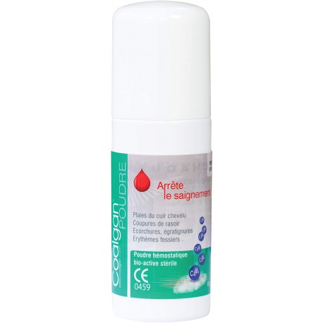 La Poudre Coalgan est une poudre hémostatique bio-active et stérile, recommandée pour stopper les saignements des plaies superficielles comme celles sur le cuir chevelu, les coupures de rasoir, les écorchures ou encore les égratignures. Sa formule composée d’Alginate de calcium permet de faire arrêter le saignement immédiatement et de réduire le temps de coagulation. Cet actif est idéal pour une cicatrication rapide et une diminution des bactéries lors de celle-ci.
